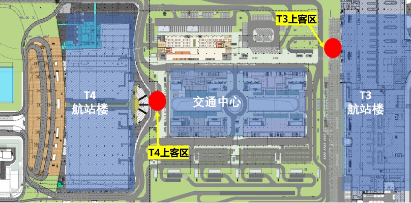 T4上客區:位于T4航站樓與交通中心F1層連廊處。